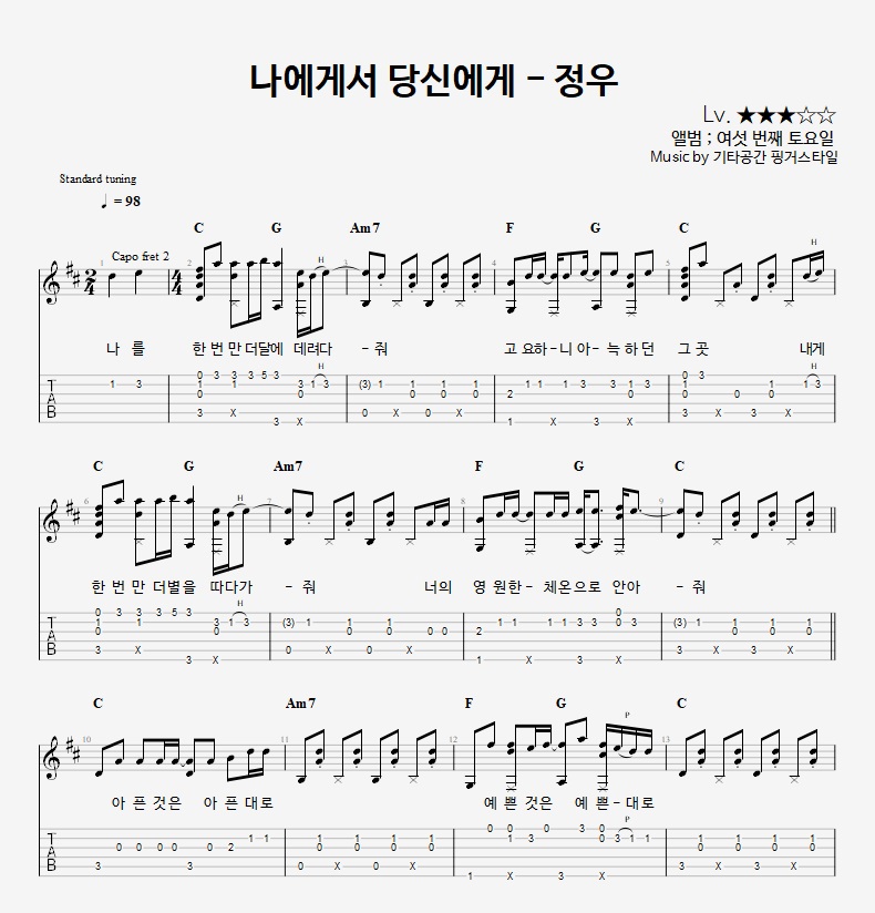 - 핑거스타일기타 편곡악보로, 타브악보가 'PDF파일' 로 제공됩니다.