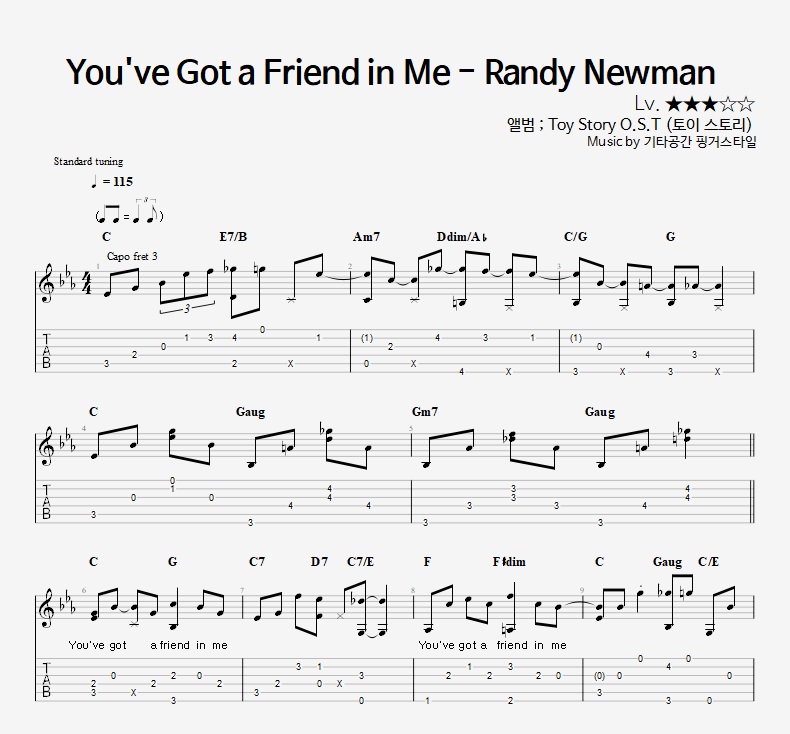 - 핑거스타일기타 편곡악보로, 타브악보가 'PDF파일' 로 제공됩니다.