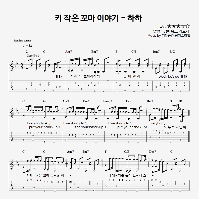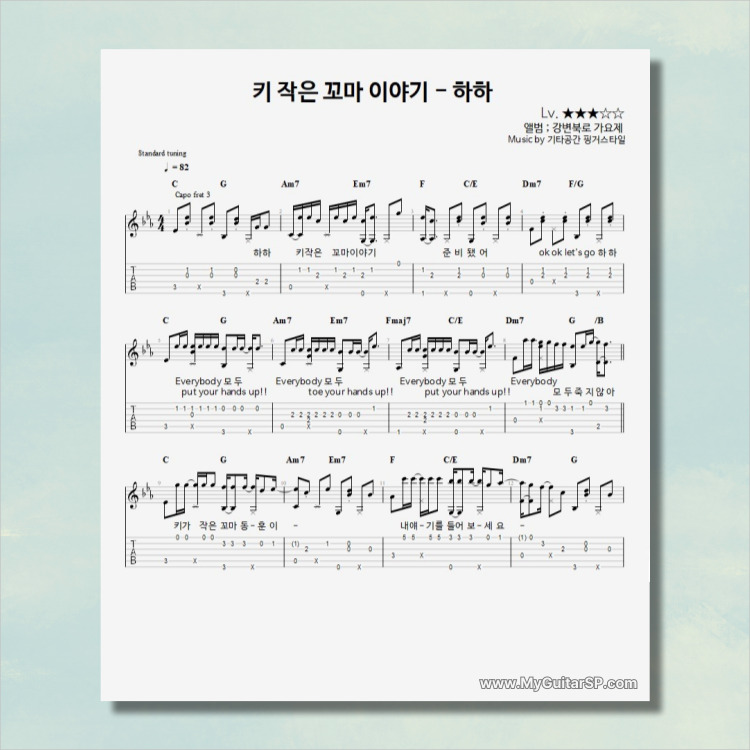 - 핑거스타일기타 편곡악보로, 타브악보가 'PDF파일' 로 제공됩니다.