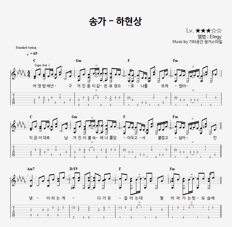 - 핑거스타일기타 편곡악보로, 타브악보가 'PDF파일' 로 제공됩니다.