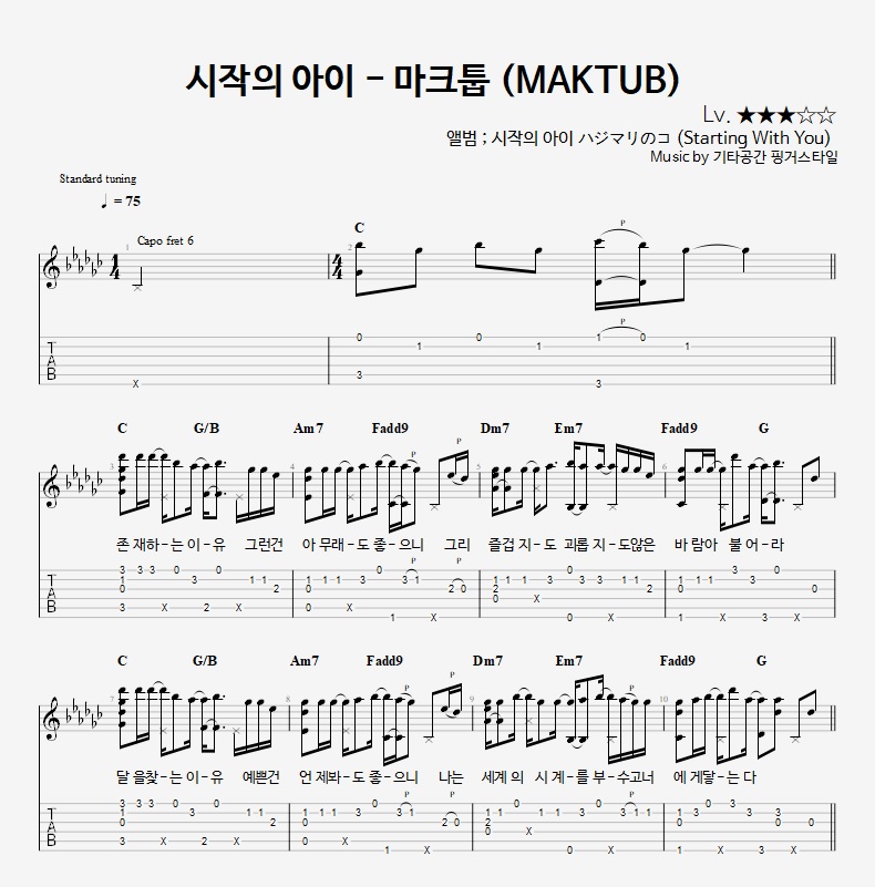 - 핑거스타일기타 편곡악보로, 타브악보가 'PDF파일' 로 제공됩니다.
