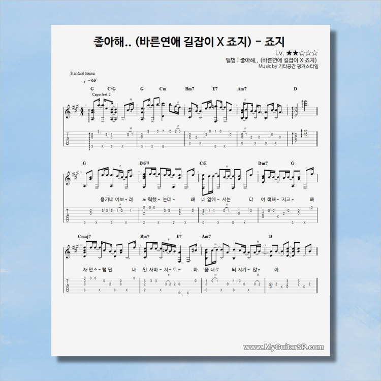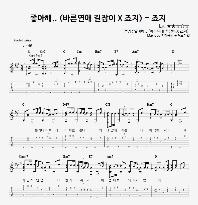 - 핑거스타일기타 편곡악보로, 타브악보가 'PDF파일' 로 제공됩니다.