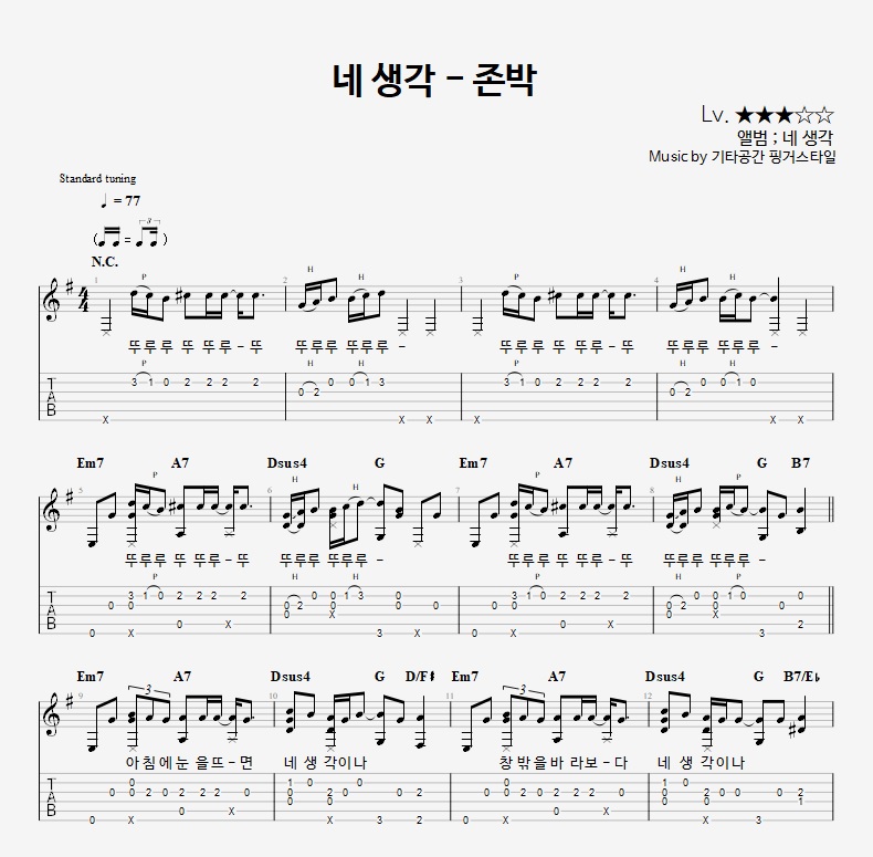 - 핑거스타일기타 편곡악보로, 타브악보가 'PDF파일' 로 제공됩니다.