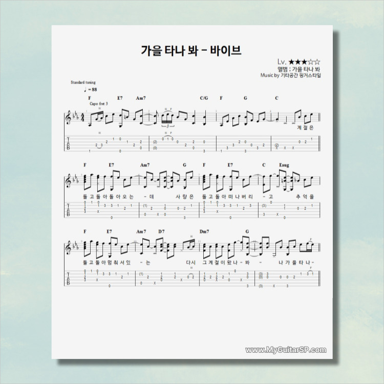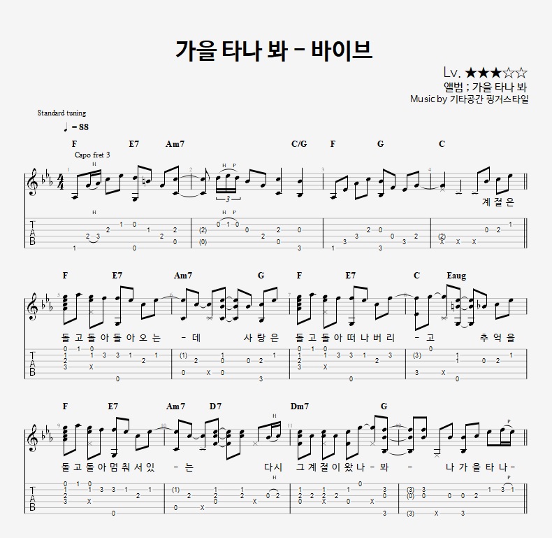 - 핑거스타일기타 편곡악보로, 타브악보가 'PDF파일' 로 제공됩니다.