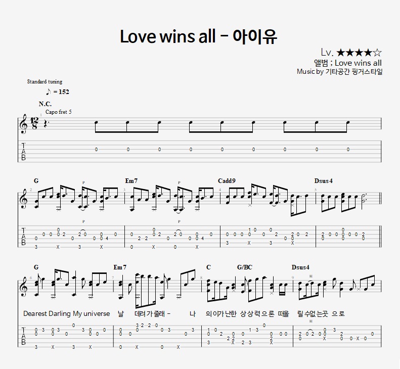- 핑거스타일기타 편곡악보로, 타브악보가 'PDF파일' 로 제공됩니다.