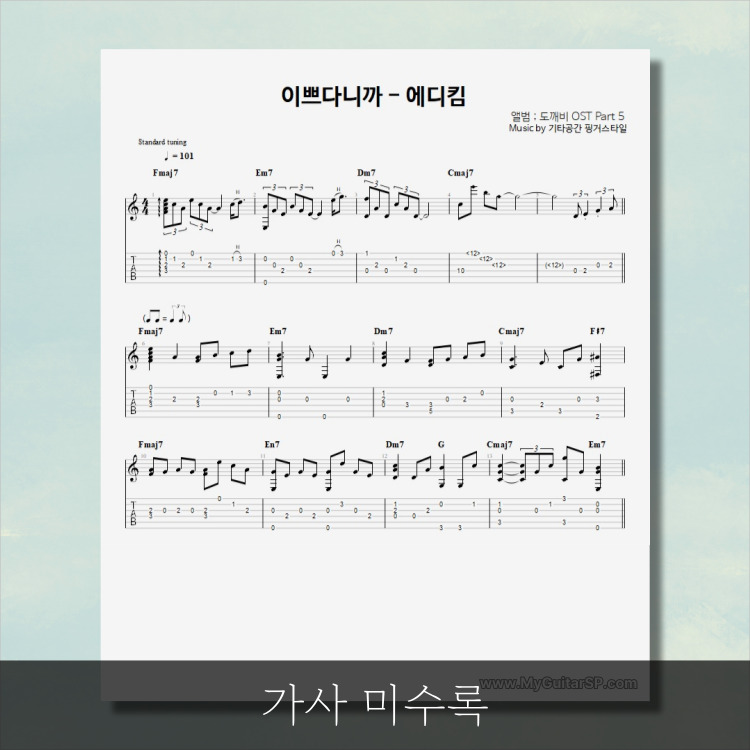 - 핑거스타일기타 편곡악보로, 타브악보가 'PDF파일' 로 제공됩니다.
