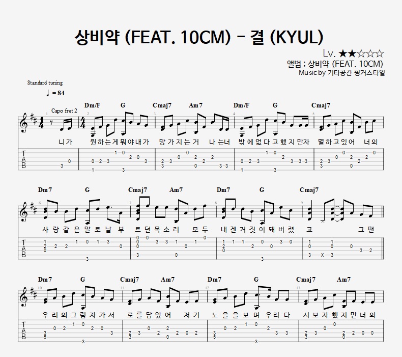 - 핑거스타일기타 편곡악보로, 타브악보가 'PDF파일' 로 제공됩니다.