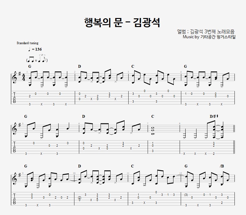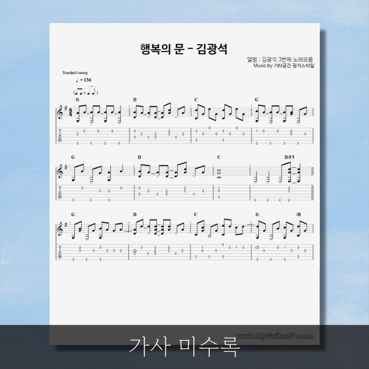 - 핑거스타일기타 편곡악보로, 타브악보가 'PDF파일' 로 제공됩니다.