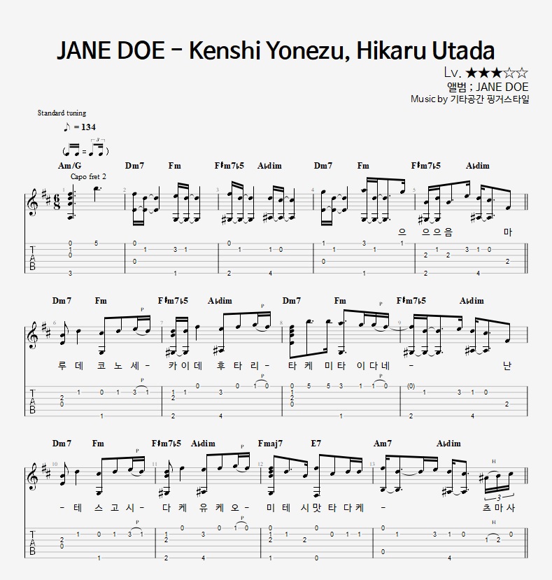 - 핑거스타일기타 편곡악보로, 타브악보가 'PDF파일' 로 제공됩니다.