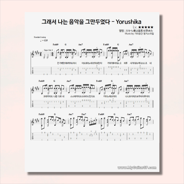 - 핑거스타일기타 편곡악보로, 타브악보가 'PDF파일' 로 제공됩니다.