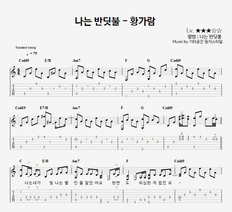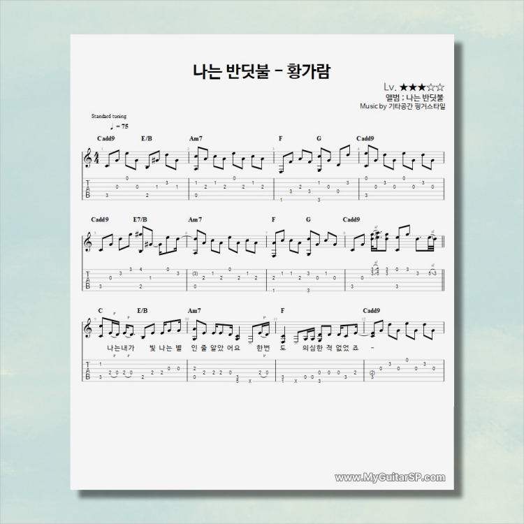 - 핑거스타일기타 편곡악보로, 타브악보가 'PDF파일' 로 제공됩니다.