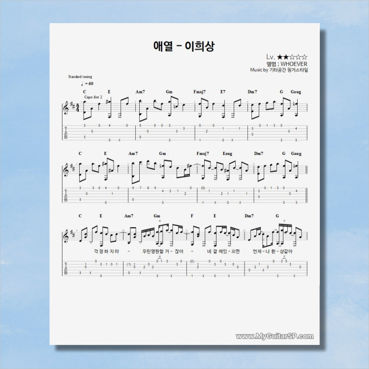 - 핑거스타일기타 편곡악보로, 타브악보가 'PDF파일' 로 제공됩니다.