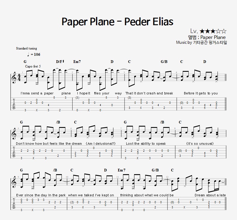 - 핑거스타일기타 편곡악보로, 타브악보가 'PDF파일' 로 제공됩니다.