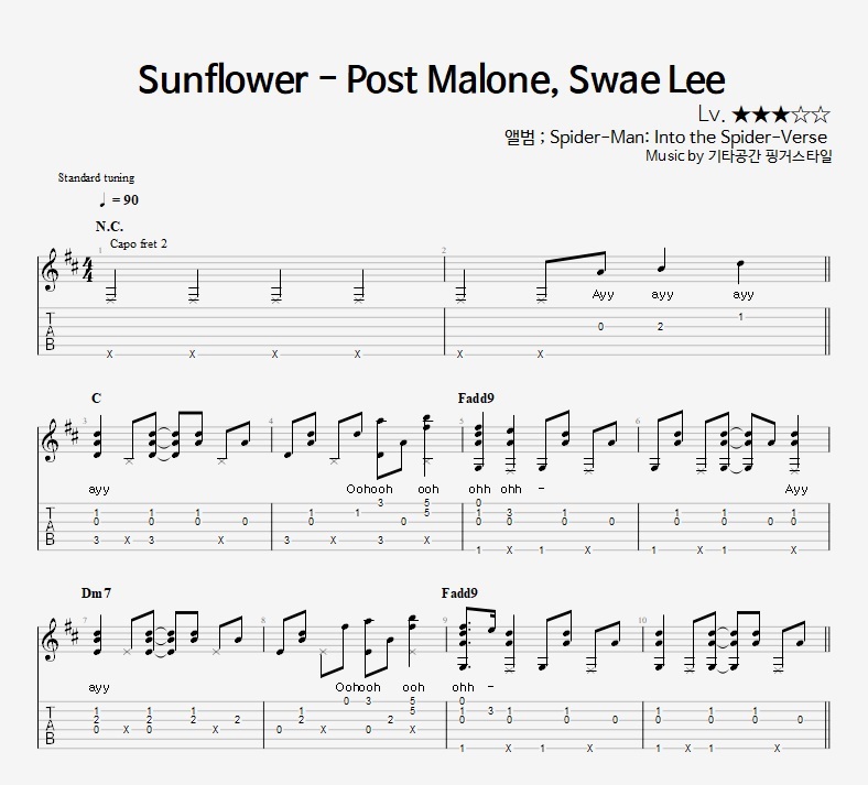 - 핑거스타일기타 편곡악보로, 타브악보가 'PDF파일' 로 제공됩니다.