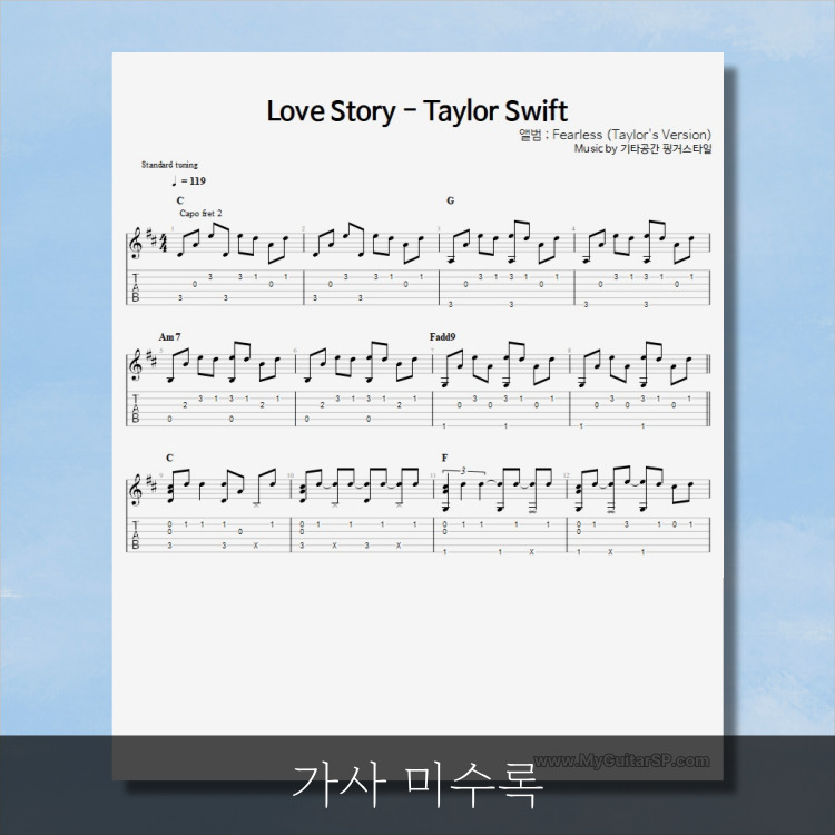 - 핑거스타일기타 편곡악보로, 타브악보가 'PDF파일' 로 제공됩니다.