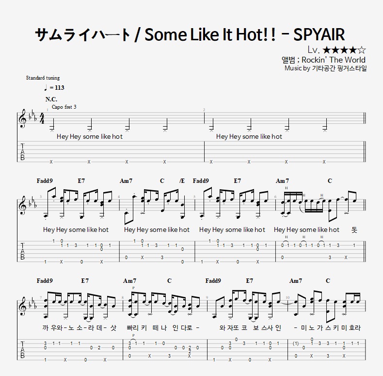 - 핑거스타일기타 편곡악보로, 타브악보가 'PDF파일' 로 제공됩니다.