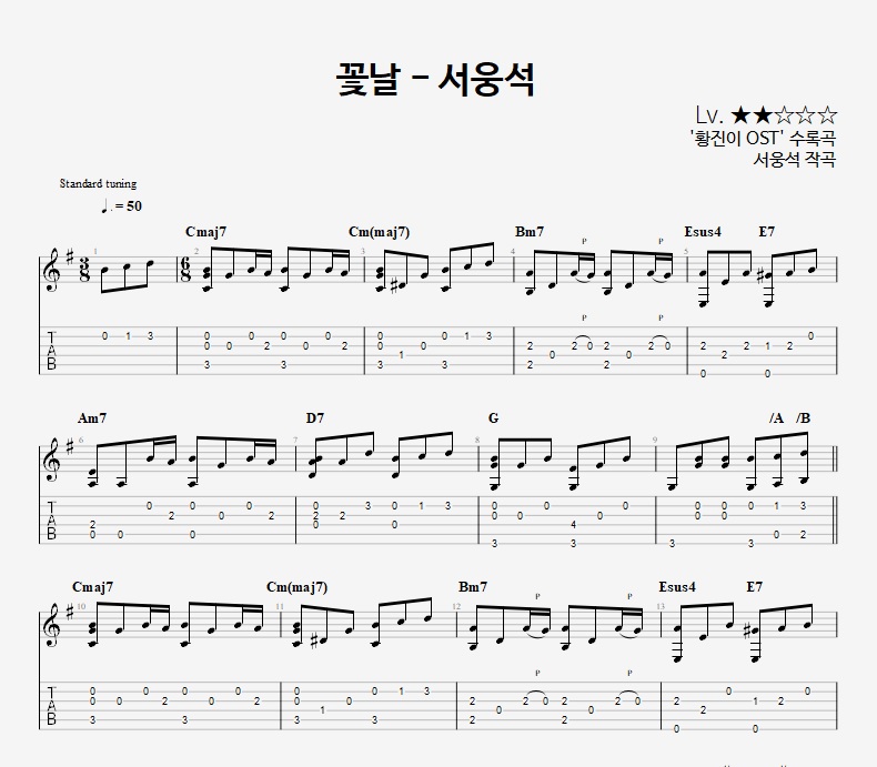 - 핑거스타일기타 편곡악보로, 타브악보가 'PDF파일' 로 제공됩니다.