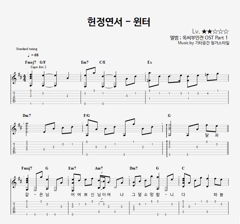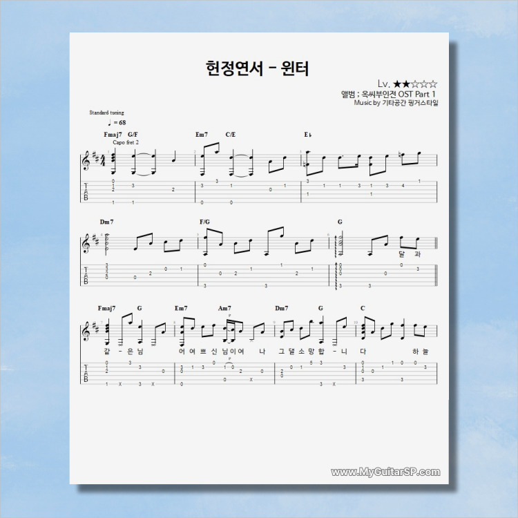 - 핑거스타일기타 편곡악보로, 타브악보가 'PDF파일' 로 제공됩니다.