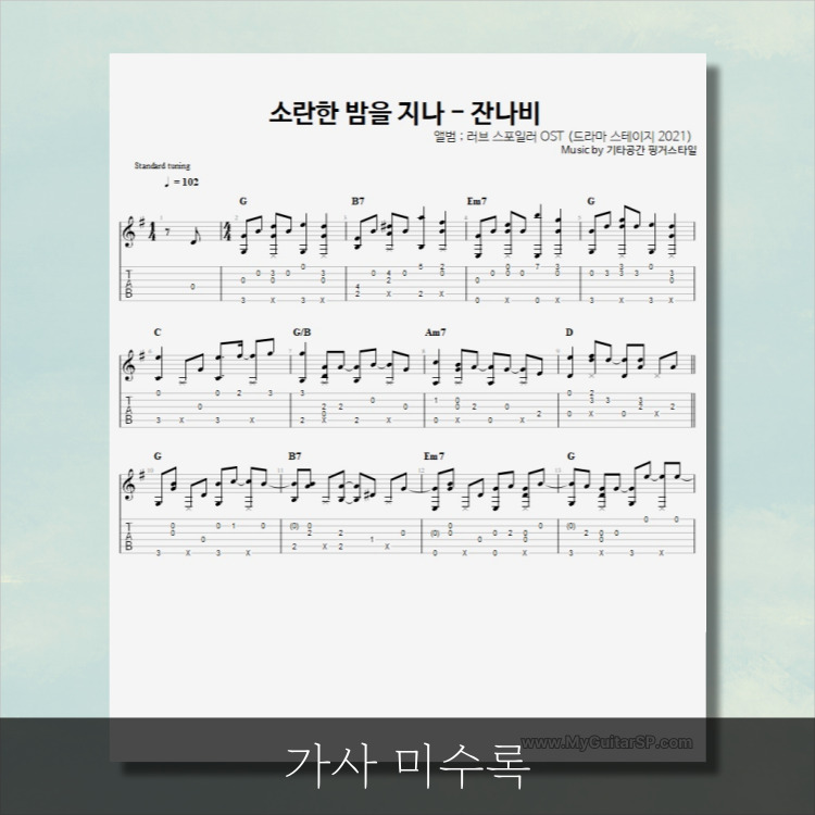 - 핑거스타일기타 편곡악보로, 타브악보가 'PDF파일' 로 제공됩니다.