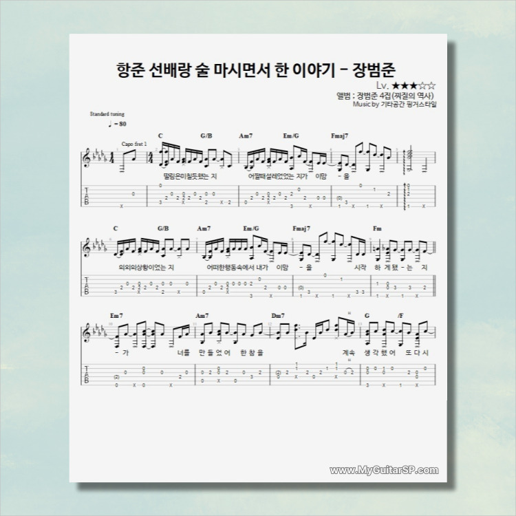 - 핑거스타일기타 편곡악보로, 타브악보가 'PDF파일' 로 제공됩니다.