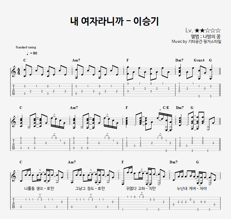 - 핑거스타일기타 편곡악보로, 타브악보가 'PDF파일' 로 제공됩니다.