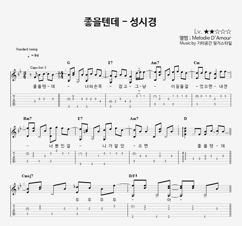 - 핑거스타일기타 편곡악보로, 타브악보가 'PDF파일' 로 제공됩니다.