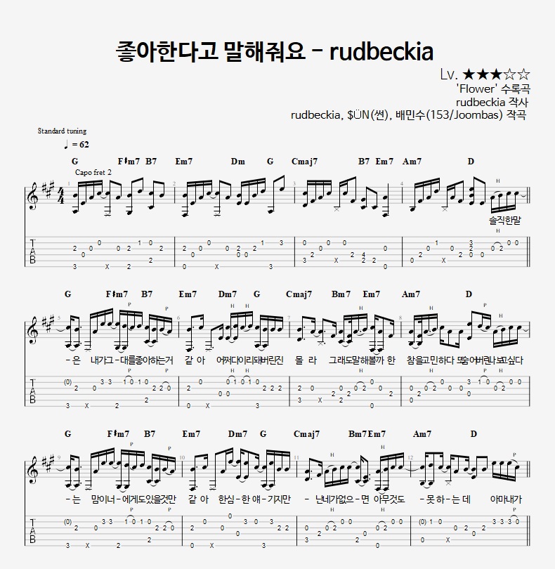- 핑거스타일기타 편곡악보로, 타브악보가 'PDF파일' 로 제공됩니다.