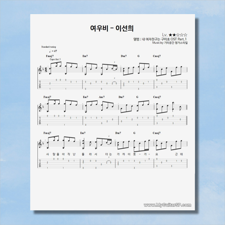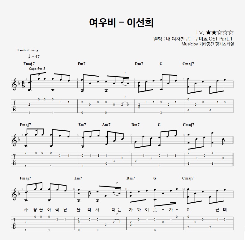 - 핑거스타일기타 편곡악보로, 타브악보가 'PDF파일' 로 제공됩니다.