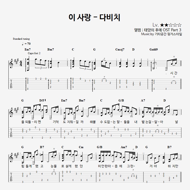 - 핑거스타일기타 편곡악보로, 타브악보가 'PDF파일' 로 제공됩니다.