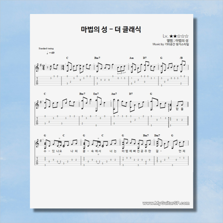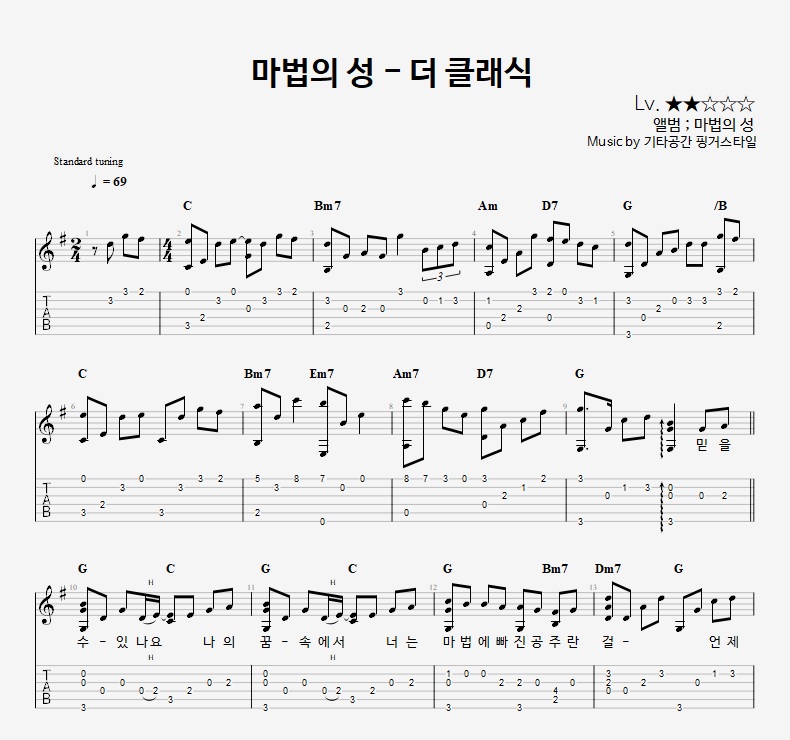 - 핑거스타일기타 편곡악보로, 타브악보가 'PDF파일' 로 제공됩니다.
