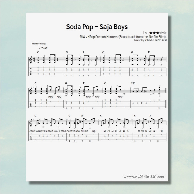 - 핑거스타일기타 편곡악보로, 타브악보가 'PDF파일' 로 제공됩니다.