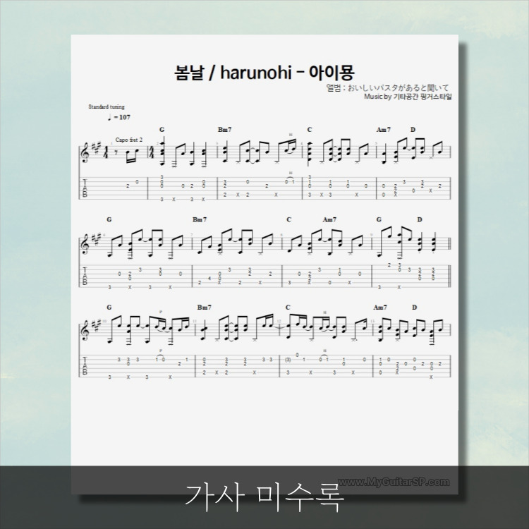 - 핑거스타일기타 편곡악보로, 타브악보가 'PDF파일' 로 제공됩니다.
